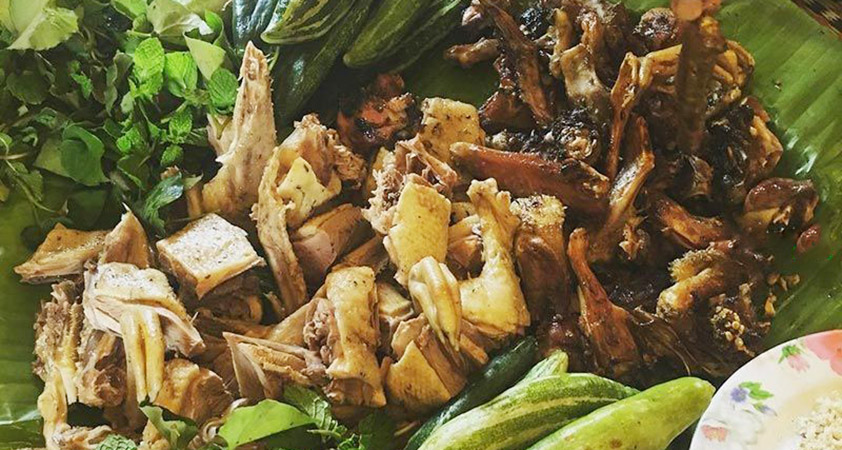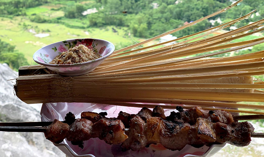 Lá bưởi quện vào thịt, dưới sức nóng của than, thịt săn vàng, toả mùi thơm. Thịt lợn chín tới, thái lát mỏng bày trên lá chuối tươi xanh. Khi ăn, chấm với muối rang và hạt dổi nướng dã nhỏ.