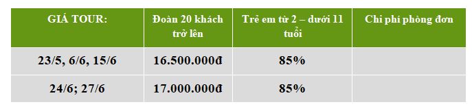 - Giá tính cho trẻ em ngủ chung giường với bố mẹ, nếu Quý khách có yêu cầu ngủ riêng cho trẻ em vui lòng thanh toán 100% giá tour.