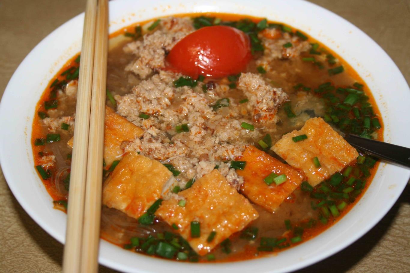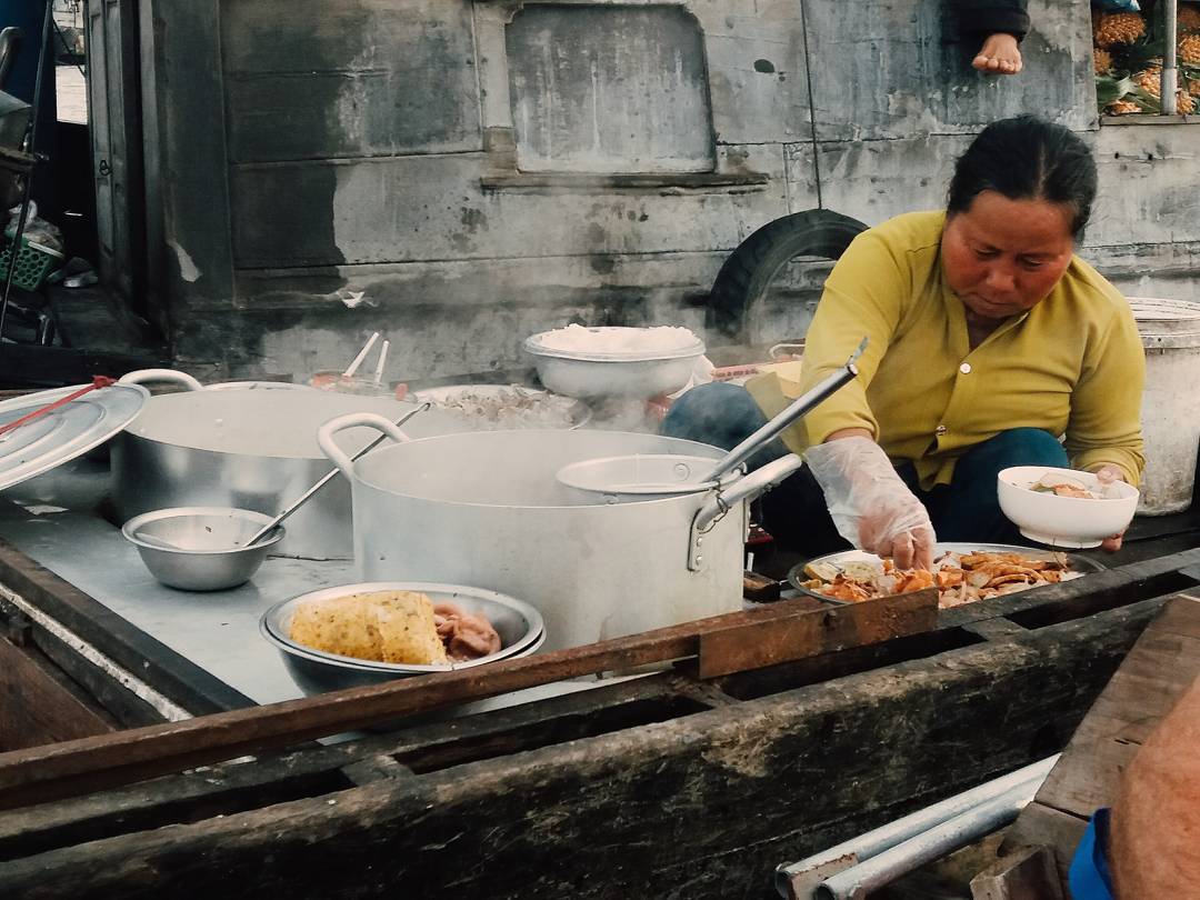 Ngồi trên ghe chòng chành giữa sóng nước, chúng tôi lại gần một chiếc ghe bán bún riêu nóng ăn sáng. Hương vị bát bún có hơi khác, nước dùng có vị ngọt của miền Tây, nhưng bàn tay bà cụ múc bún trông không khác bàn tay những cụ bán bún riêu ngoài Hà Nội, mà chúng tôi thường ăn từ ngày còn thơ ấu. Cũng rám nắng với những đường gân xanh nổi rõ.