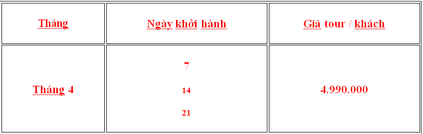 LỊCH KHỞI HÀNH + GIÁ TOUR TRỌN GÓI CHO 1 KHÁCH